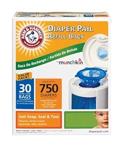 Arm and Hammer Diaper Pail by Munchkin Refill Bags lock in odors. Each bag shuts tight with a snap and can be easily tossed and replaced without cutting or tying. The 30 count refill package can hold up to 750 diapers (25 per bag) and are intended to be used only with the Arm and Hammer Diaper Pail.
